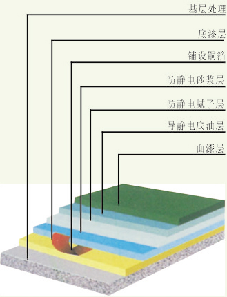 | 砂漿層 | 用導(dǎo)靜電環(huán)氧中涂調(diào)石英砂至施工所要求的厚度 | 導(dǎo)靜電環(huán)氧中涂 | 石英砂 | 0.3kg/m2.mm |